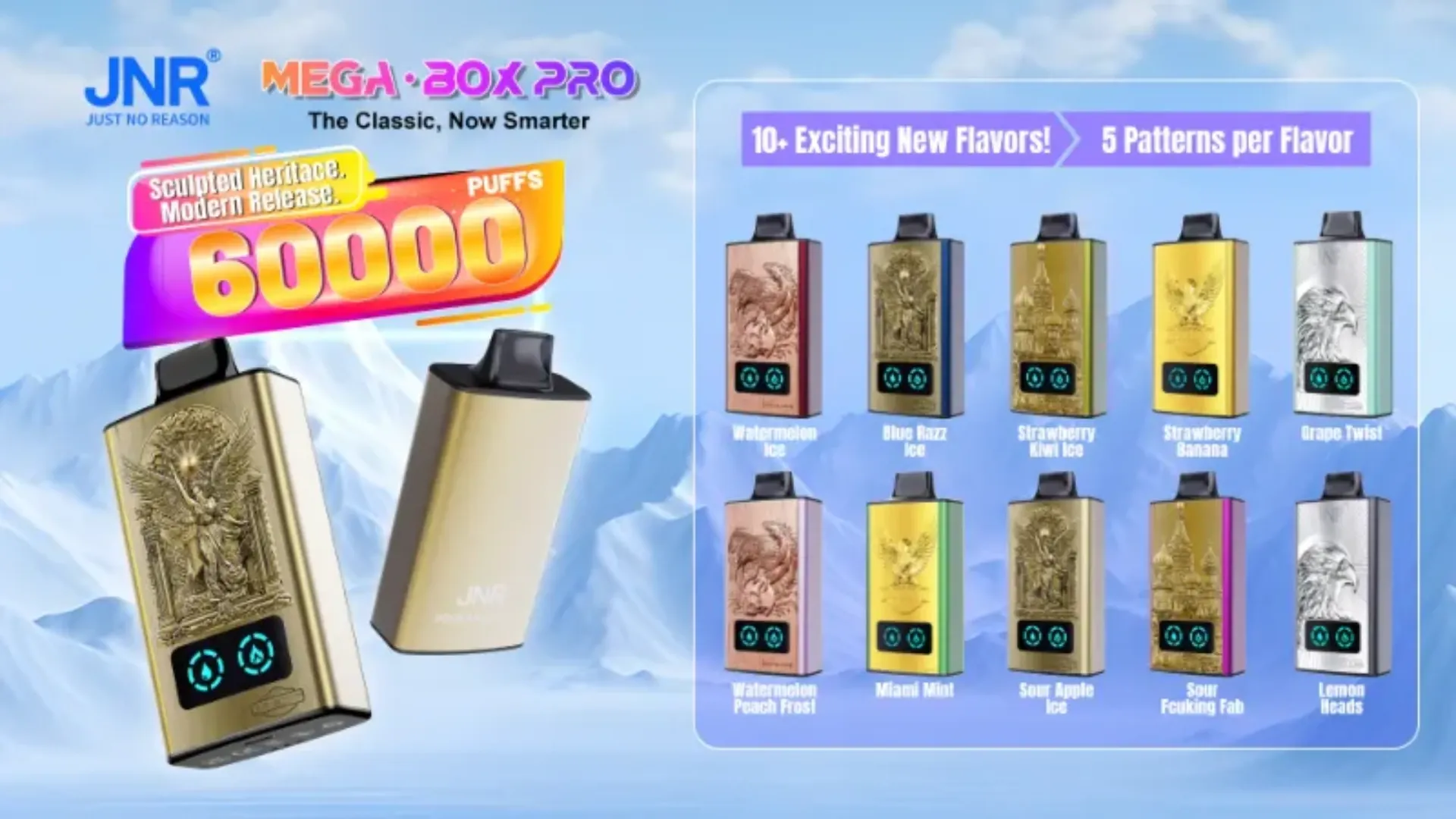 JNR MEGA BOX PRO 60K proves itself at the first place with its incomparable longevity of up to 50,000 puffs. But beyond the mere durability, the MEGA BOX PRO also boasts a premium embossed metal texture and an integrated Smart Screen, aiming to offer a much more intuitive and luxurious vaping experience. Equipped with 1.2Ω Dual Mesh Coil technology and a powerful Dual Core system, it ensures consistent flavor delivery and refined satisfaction across its 20 master-crafted flavors.